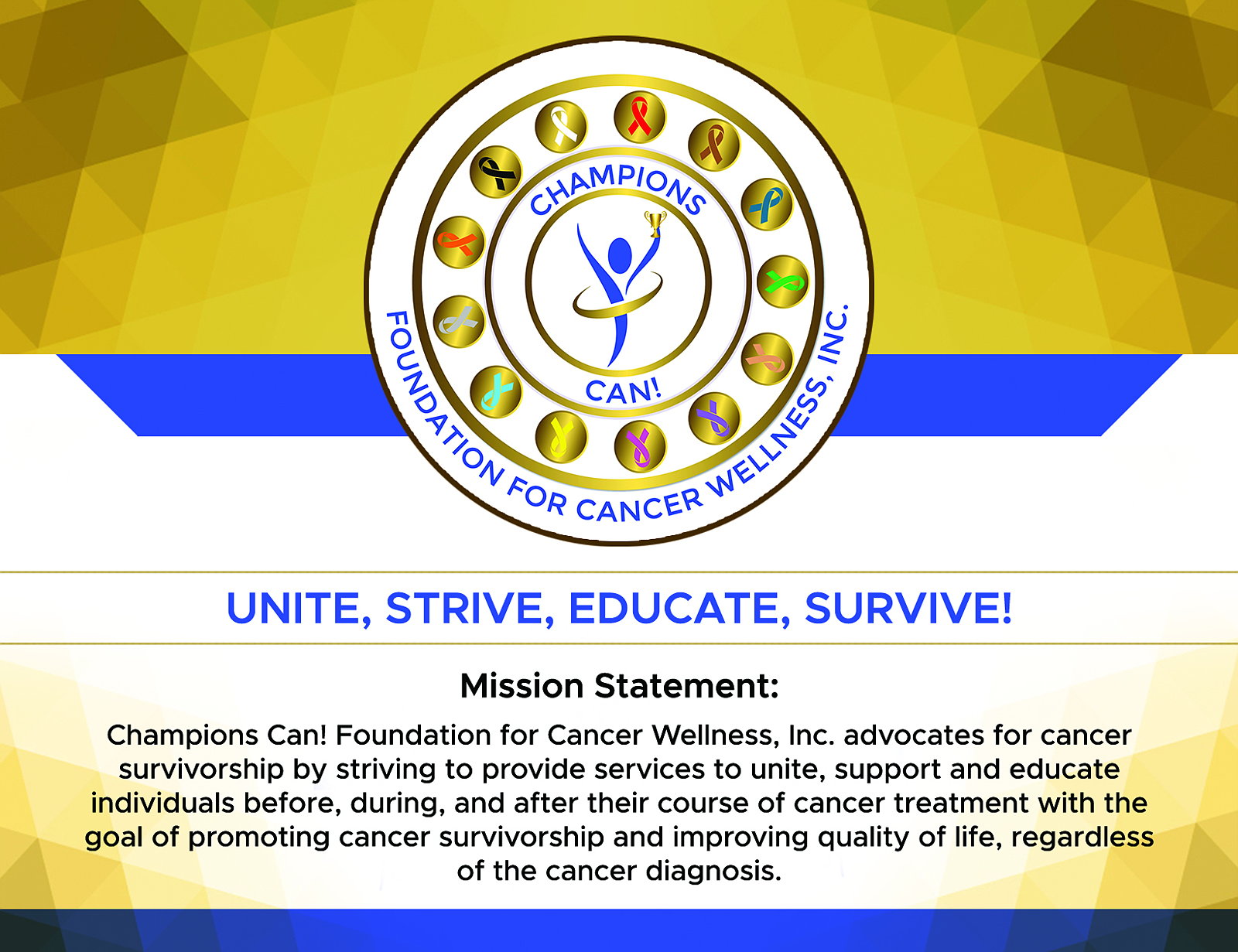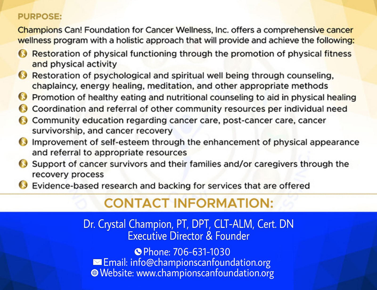 Champions Can! Foundation for Cancer Wellness, Inc. was founded by Dr. Crystal A. Champion, a Physical Therapist and Certified Lymphedema Therapist, who specializes in the treatment and rehabilitation of cancer patients who have developed functional impairments as a result of their cancer treatment. She has family and friends that have been affected by cancer and have endured unwanted side-effects, leading to a decline in physical function and poor quality of life. In her experience as a healthcare practitioner, Dr. Champion saw the need to serve cancer patients on a larger scale by taking a more holistic approach to restoring psychological well-being, physical functioning, and quality of life. These elements in the overall cancer treatment plan are often not addressed. Dr. Champion has gained more awareness surrounding the gaps in cancer education in addition to the limited focus on cancer survivorship once cancer treatment has been completed. The organization strives to be the leader in the promotion of cancer survivorship for all diagnoses.