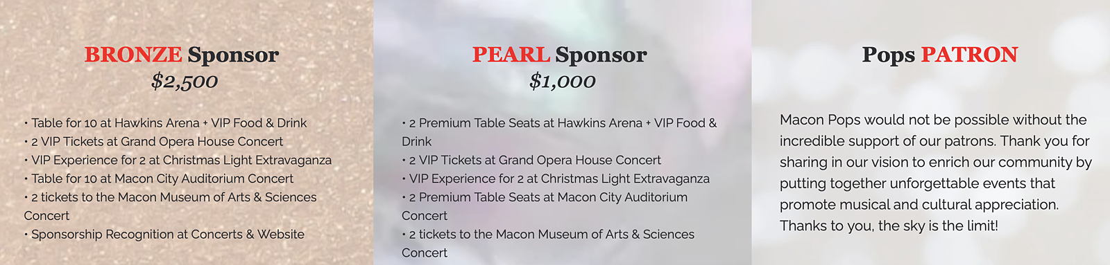For starters, we're not your average orchestra; from the music of Stevie Wonder to The Beatles to country and rock...we are dedicated to making GREAT music accessible for all those in Middle Georgia. Macon Pops would not be possible without the support of our incredible patrons and sponsors, people just like you. We need your help so that we can continue our mission, providing innovative, world-class, FUN music for all those in Middle Georgia (and beyond). So become a "POPS" Star today, and donate to support your Macon Pops!
