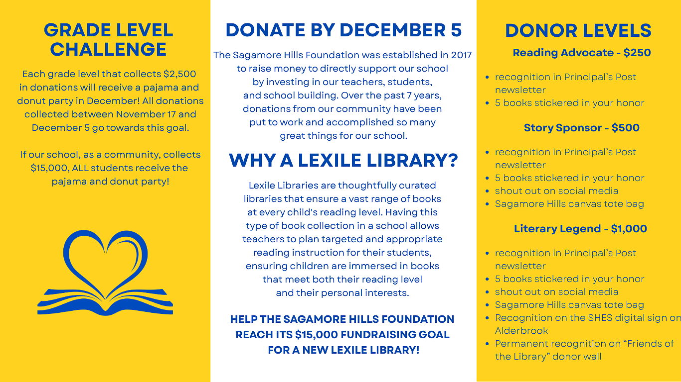 The Sagamore Hills Foundation provides much-needed funding for priority initiatives to ensure our school can offer students a best-in-class education in a positive environment for learning. Donations to the Foundation are used to support teacher requested projects and equipment, STEM programming and materials, staff professional training and support, priority needs identified by the principal, and capital facility improvements.