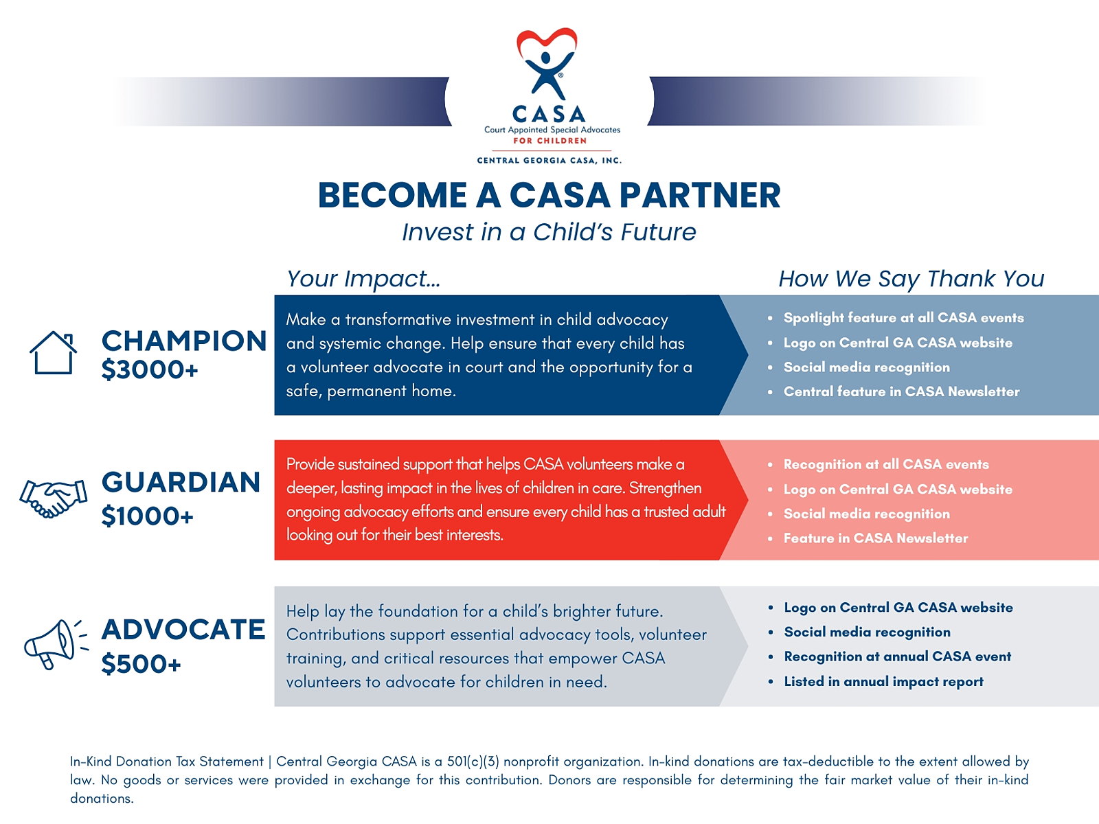 Support Central Georgia CASA’s mission by investing in best-interest advocacy for every child to help strengthen their path to a safe, permanent home.