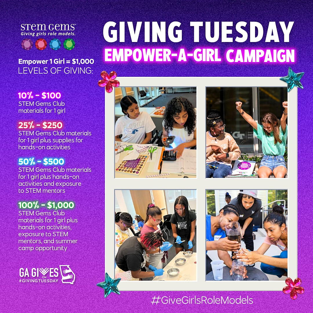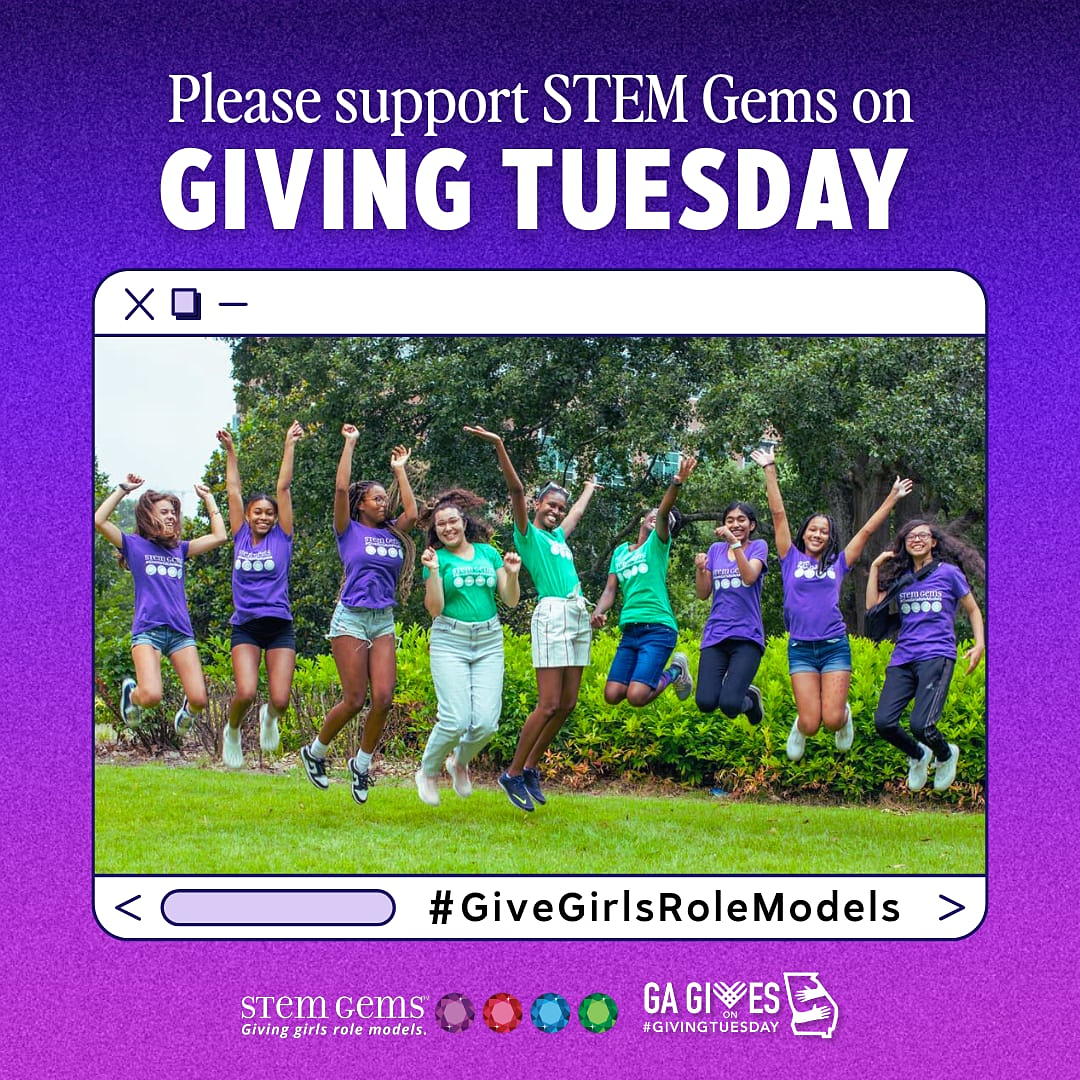 'Tis the season for giving! On behalf of STEM Gems' executive director Stephanie Espy, our advisory board members, staff, and supporters, THANK YOU for your donation in support of our Giving Tuesday Empower-A-Girl Campaign! We have a goal of 100 donors for this campaign, and we appreciate a gift of any amount to help us reach our goal.