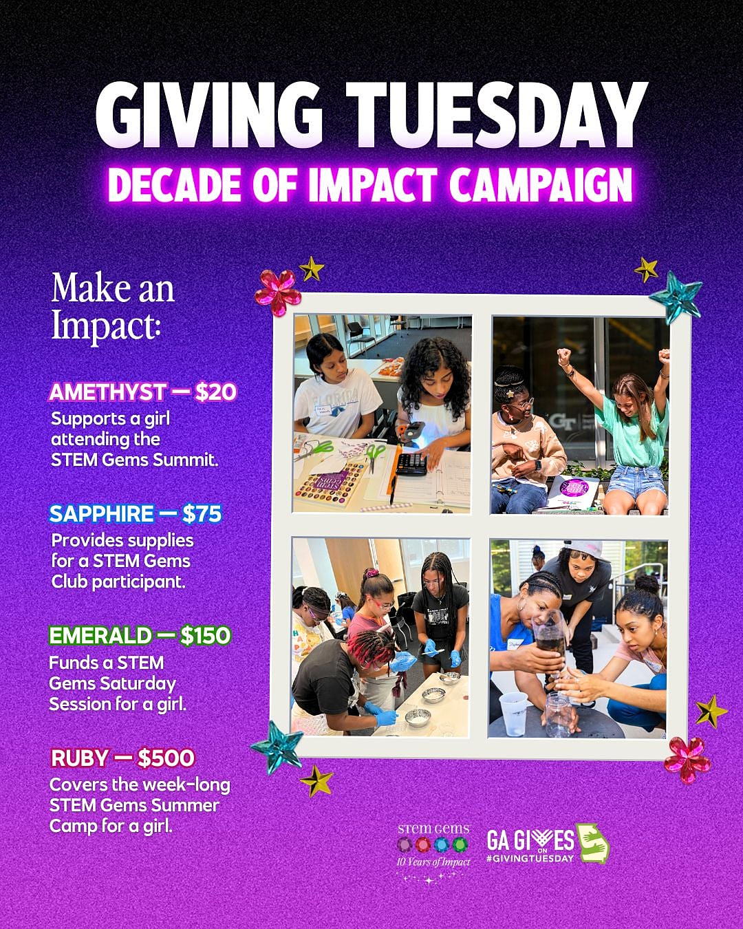 On behalf of STEM Gems' founder and executive director Stephanie Espy, our advisory board members, staff, and supporters, THANK YOU for your donation in support of our Giving Tuesday "10 Years of Impact" Campaign! We appreciate your support!