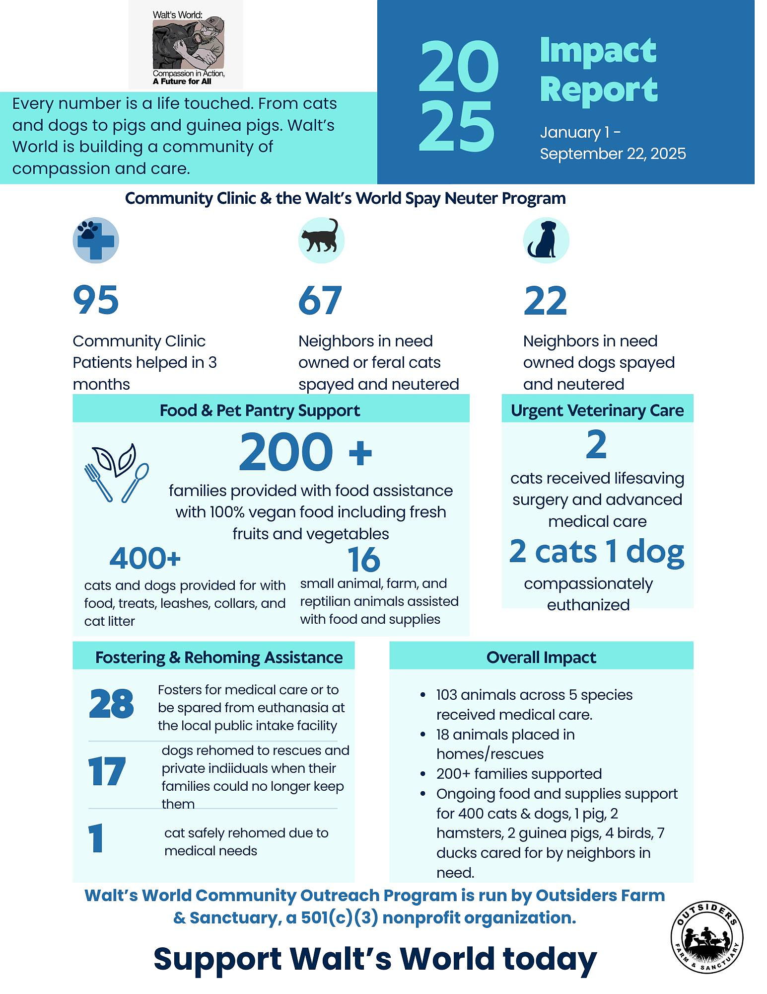 Through our programs and partnerships, we aim to bring Walt’s dream to life: a world where all beings are treated with the dignity they deserve, where compassion guides every action, and where sustainability and love define our future. In honor of Walt, who taught us that the greatest strength lies in gentleness and that the most powerful change starts with kindness, the community outreach and education program continues to champion the vision of Walt’s World—a legacy that will live on through the choices we make and the world we build together.