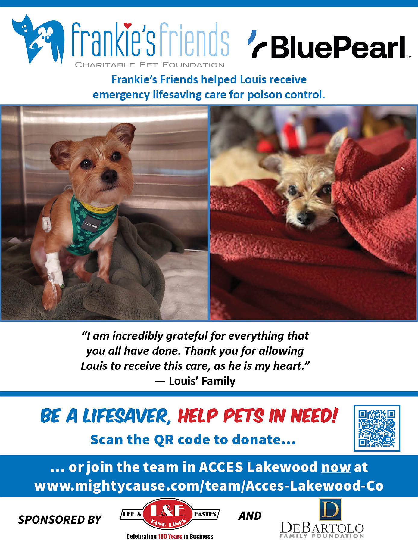 Animal Critical Care and Emergency Services of Lakewood, CO and BluePearl Veterinary Partners are proud to support the work of Frankie's Friends by participating in Paws for a Cause to help family owned pets in need of lifesaving veterinary care their owners can't afford. Will you help us?
