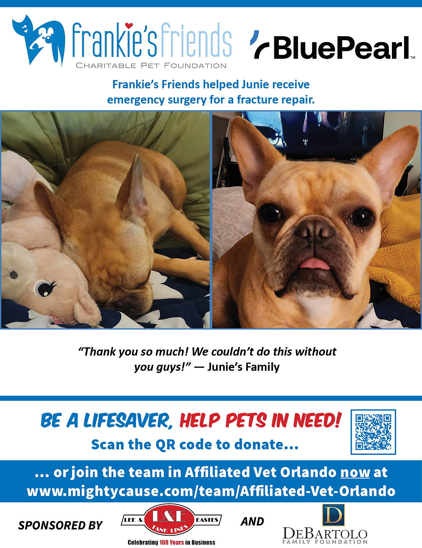 Affiliated Veterinary Specialists and BluePearl Veterinary Partners are proud to support the work of Frankie's Friends by participating in Paws for a Cause to help family owned pets in need of lifesaving veterinary care their owners can't afford. Will you help us?