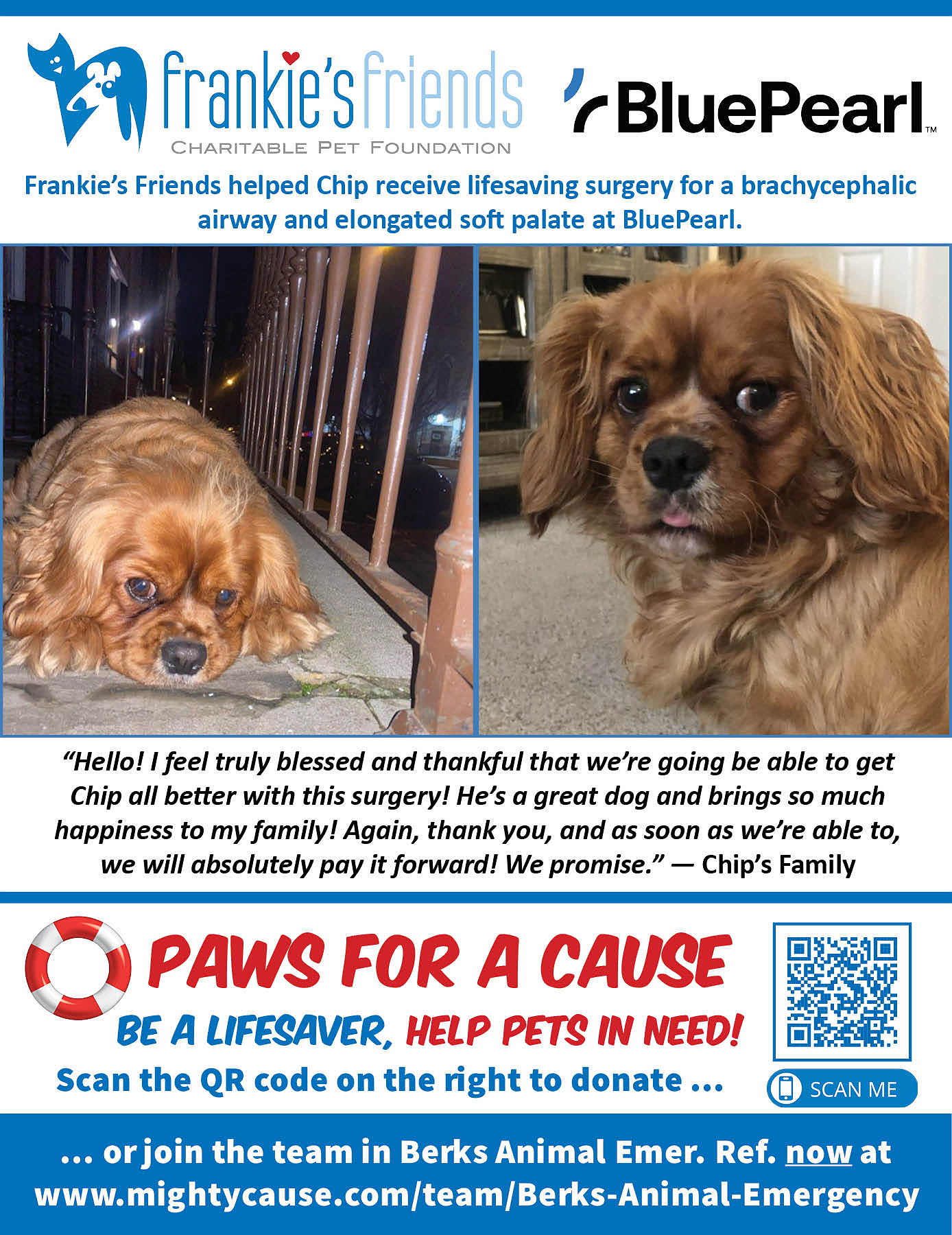 Berks Animal Emergency and Referral Center and BluePearl Veterinary Partners are proud to support the work of Frankie's Friends by participating in Paws for a Cause to help family owned pets in need of lifesaving veterinary care their owners can't afford. Will you help us?