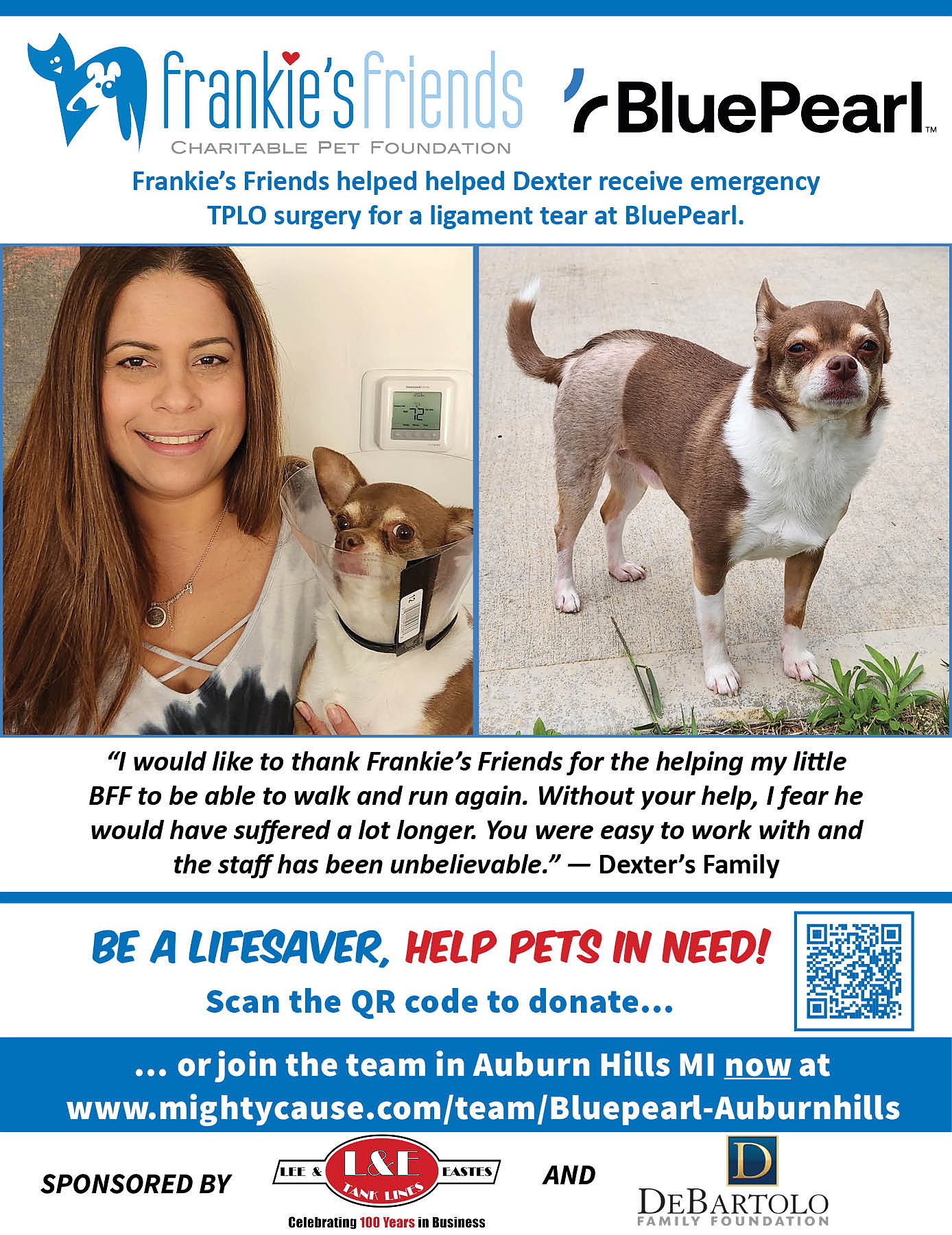 BluePearl Veterinary Partners is proud to support the work of Frankie's Friends by participating in Paws for a Cause to help family owned pets in need of lifesaving veterinary care their owners can't afford. Will you help us?