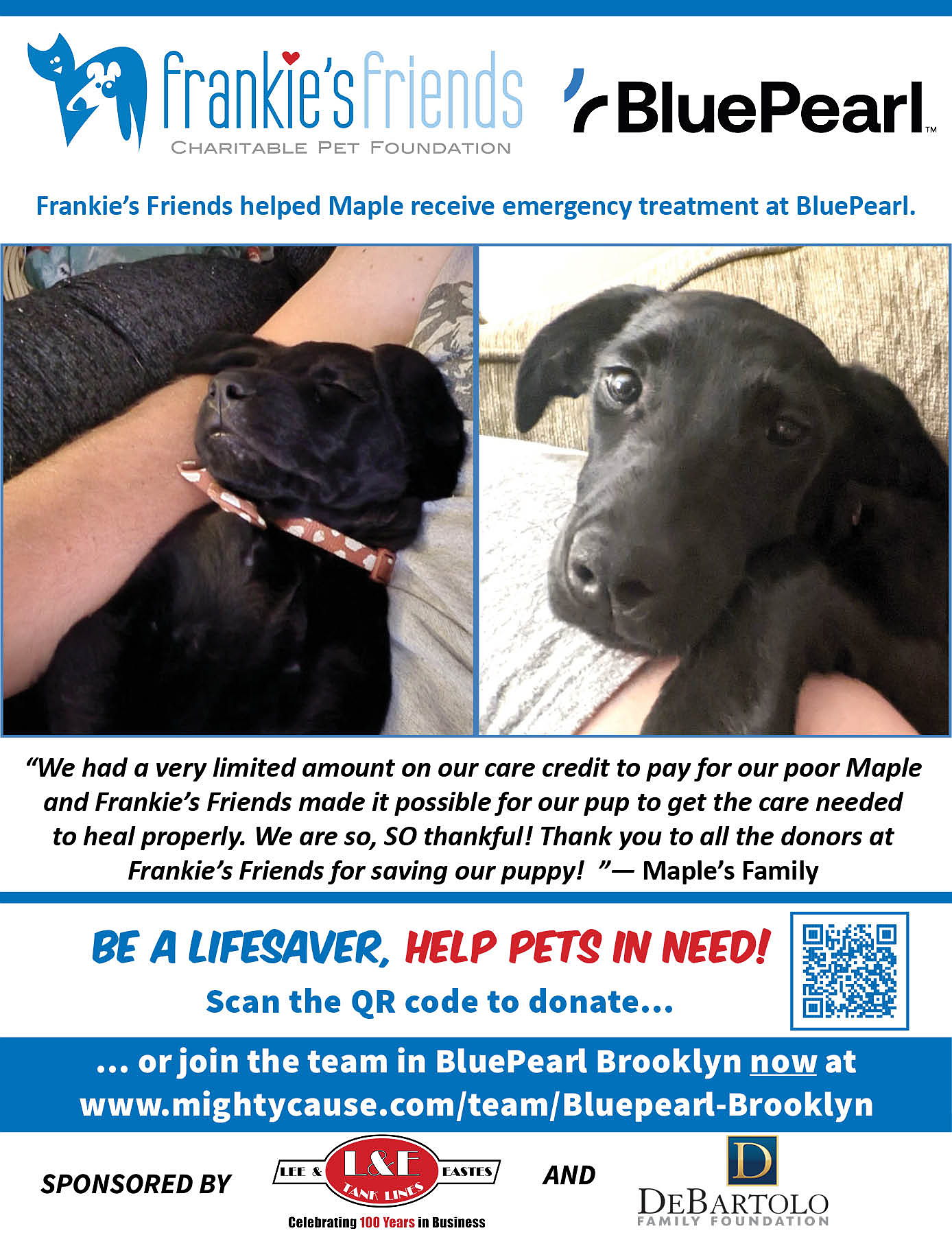 BluePearl Veterinary Partners is proud to support the work of Frankie's Friends by participating in Paws for a Cause to help family owned pets in need of lifesaving veterinary care their owners can't afford. Will you help us?