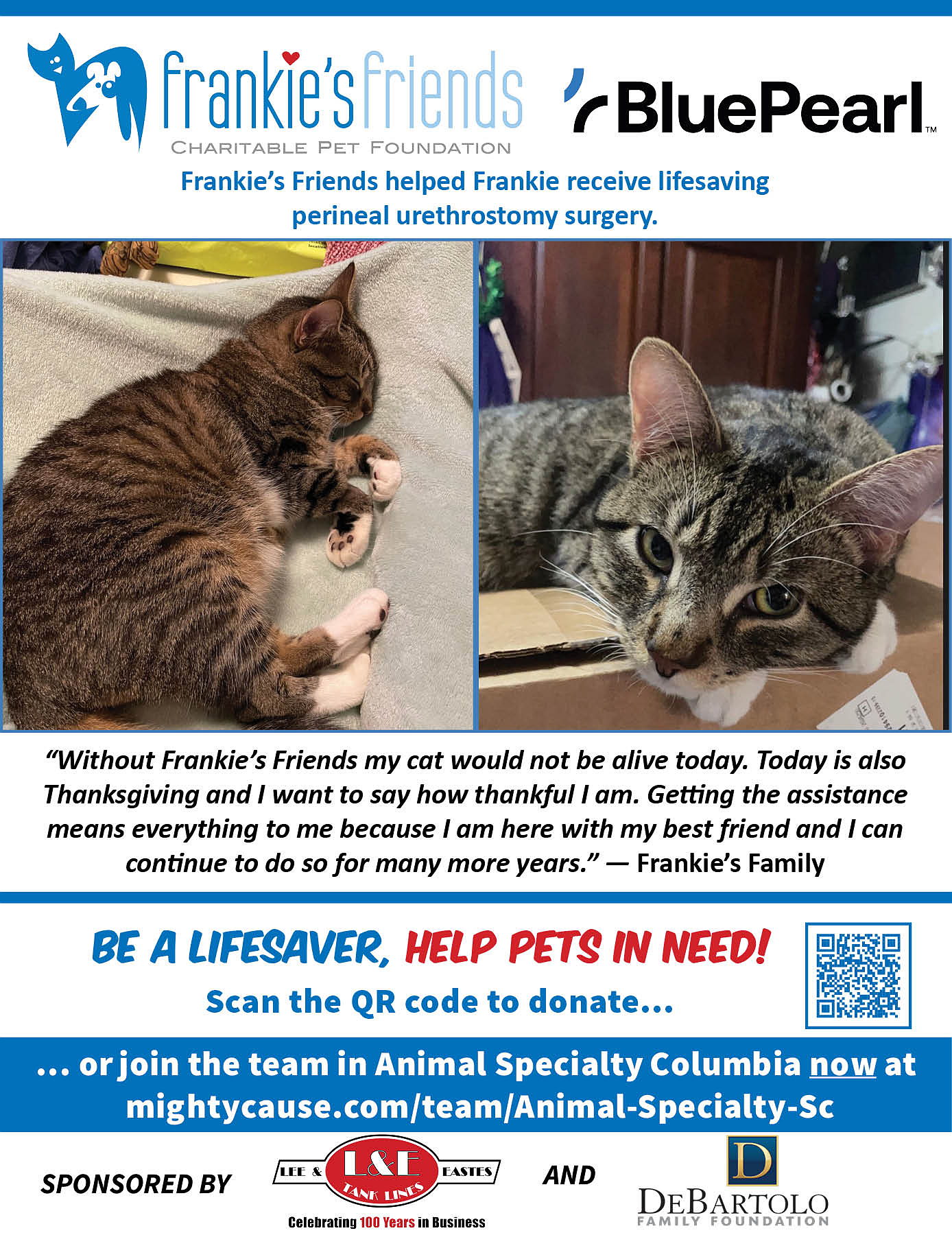 Animal Specialty Center of SC and BluePearl Veterinary Partners are proud to support the work of Frankie's Friends by participating in Paws for a Cause to help family owned pets in need of lifesaving veterinary care their owners can't afford. Will you help us?