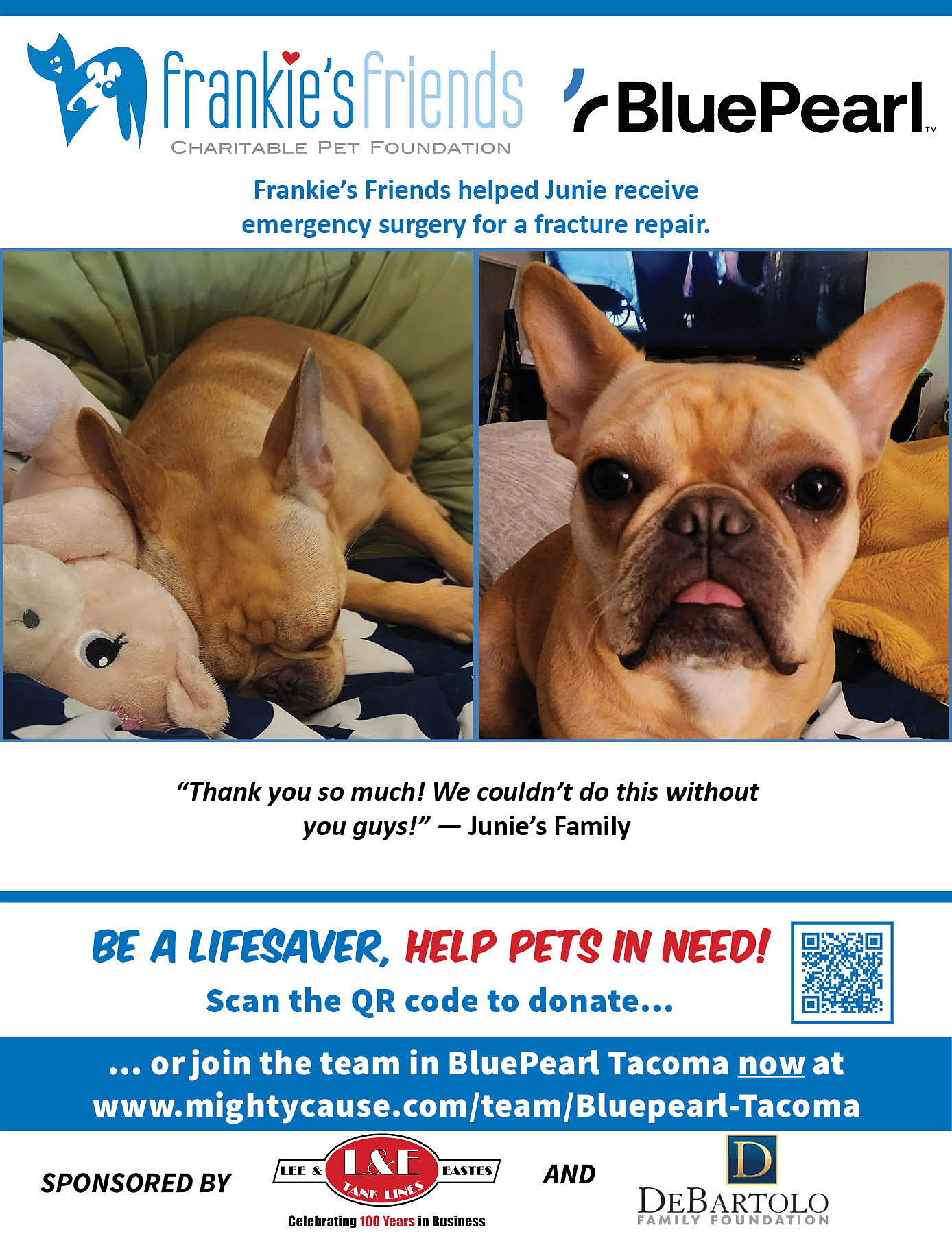 BluePearl Veterinary Partners is proud to support the work of Frankie's Friends by participating in Paws for a Cause to help family owned pets in need of lifesaving veterinary care their owners can't afford. Will you help us?