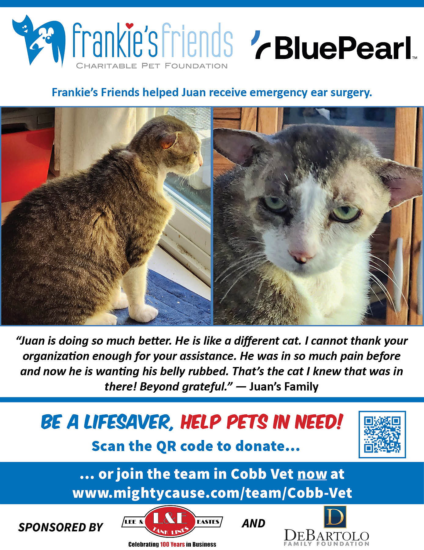 Cobb Vet Emergency Clinic and BluePearl Veterinary Partners are proud to support the work of Frankie's Friends by participating in Paws for a Cause to help family owned pets in need of lifesaving veterinary care their owners can't afford. Will you help us?