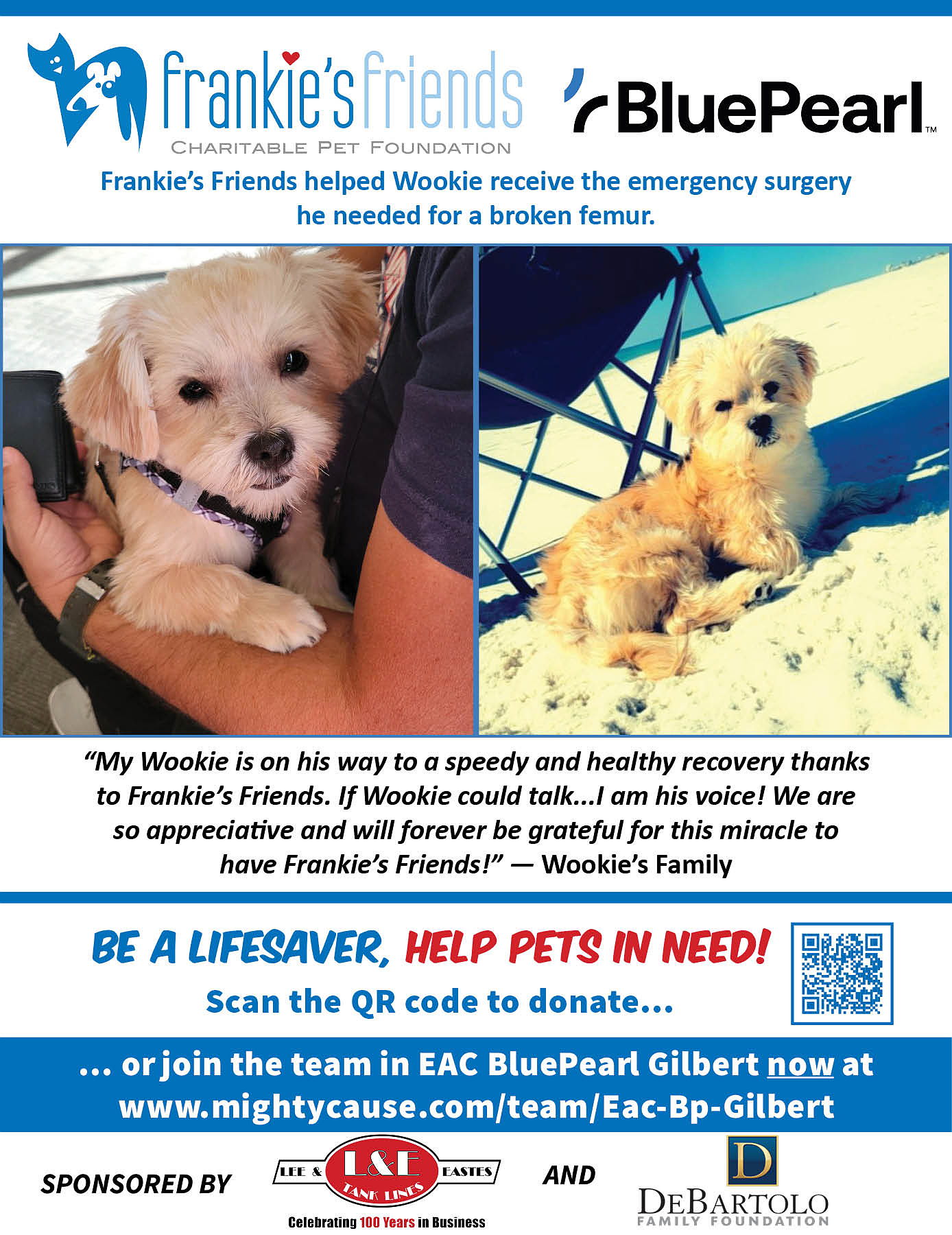 Emergency Animal Clinic of Gilbert, AZ and BluePearl Veterinary Partners are proud to support the work of Frankie's Friends by participating in Paws for a Cause to help family owned pets in need of lifesaving veterinary care their owners can't afford. Will you help us?