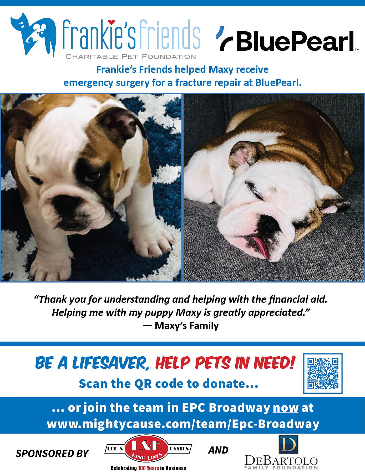 Emergency Pet Center and BluePearl Veterinary Partners are proud to support the work of Frankie's Friends by participating in Paws for a Cause to help family owned pets in need of lifesaving veterinary care their owners can't afford. Will you help us?