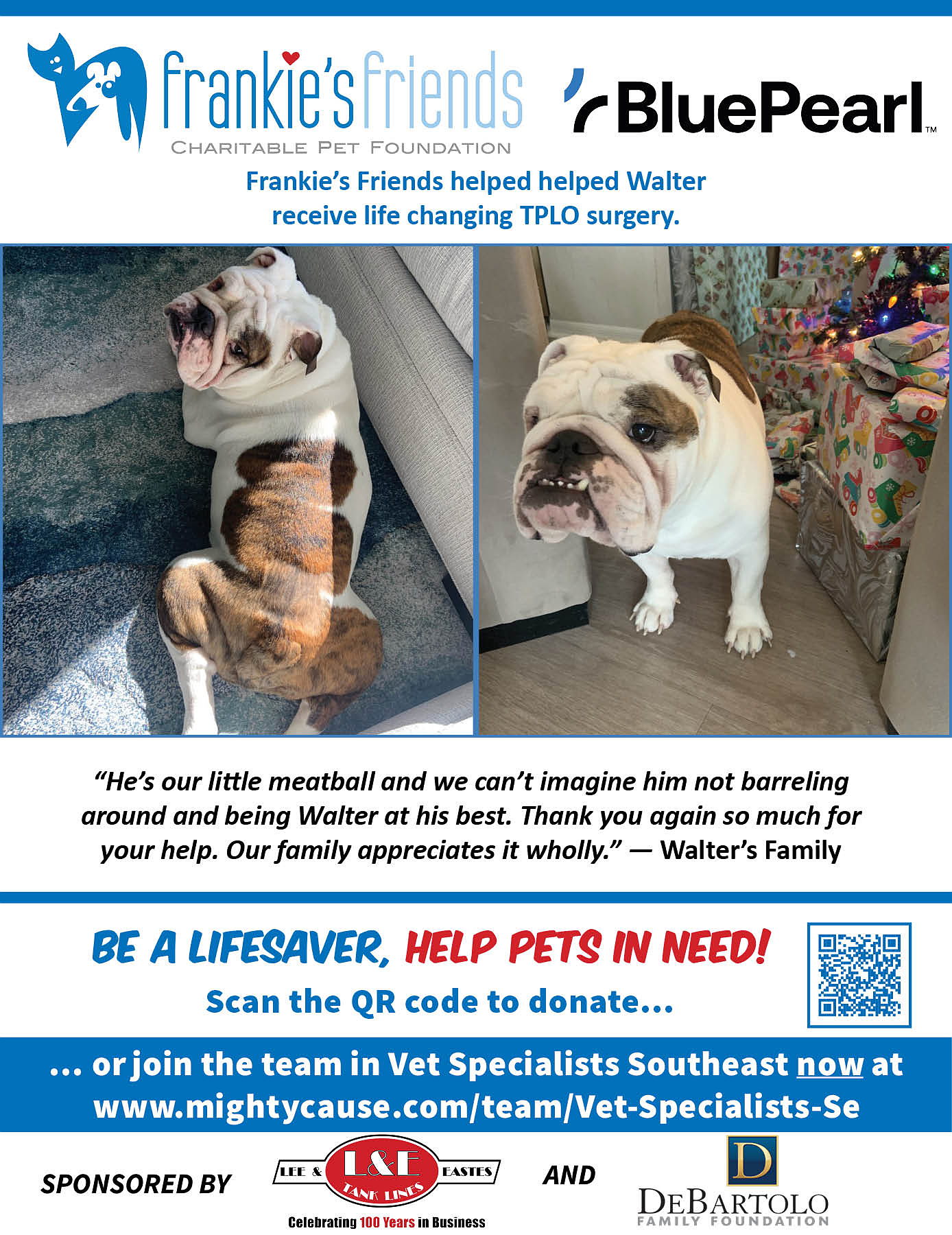 Veterinary Specialists of the Southeast and BluePearl Veterinary Partners are proud to support the work of Frankie's Friends by participating in Paws for a Cause to help family owned pets in need of lifesaving veterinary care their owners can't afford. Will you help us?