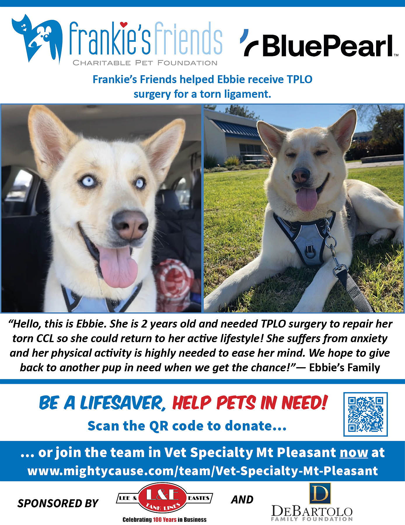 Veterinary Specialty Care and BluePearl Veterinary Partners are proud to support the work of Frankie's Friends by participating in Paws for a Cause to help family owned pets in need of lifesaving veterinary care their owners can't afford. Will you help us?
