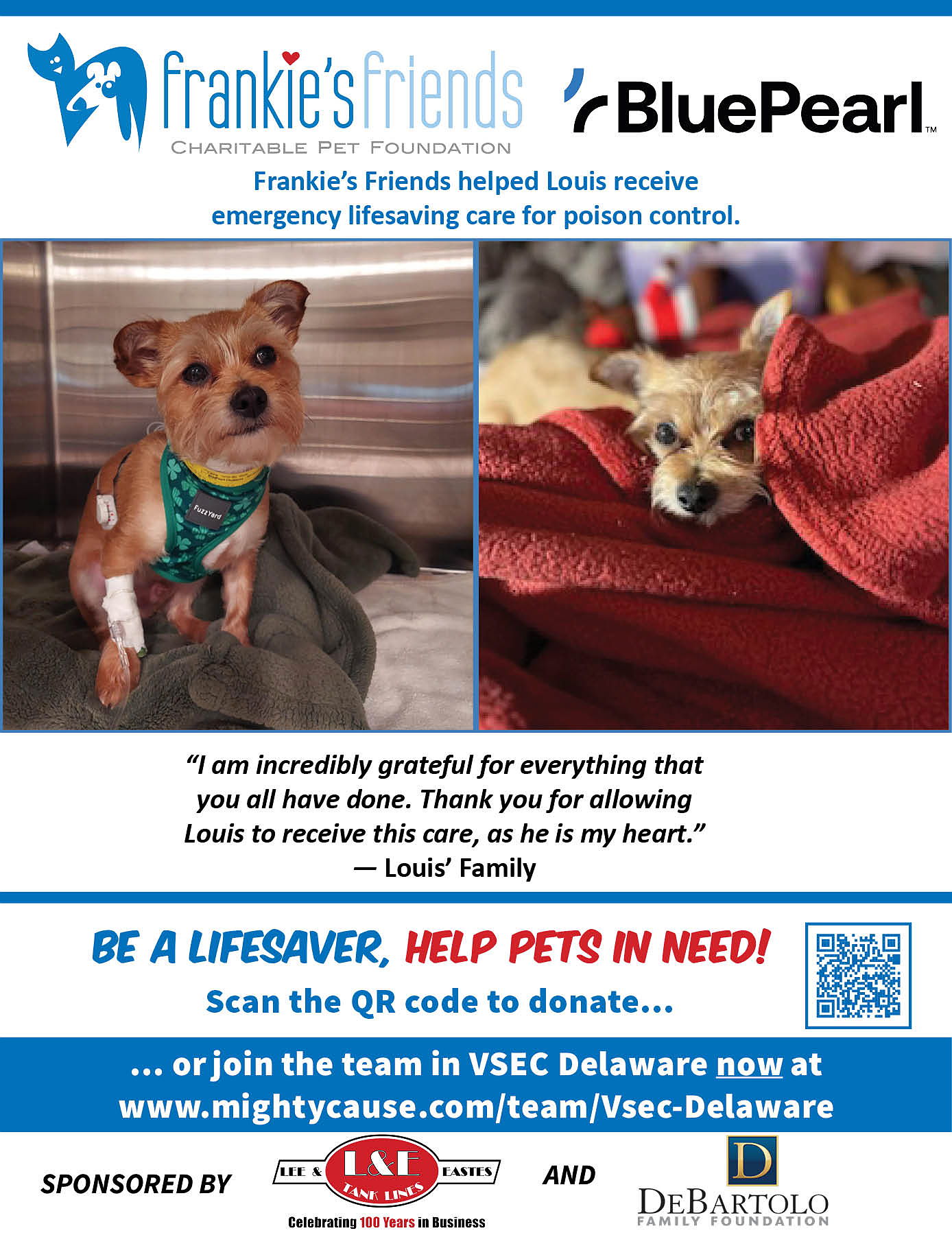 BluePearl Veterinary Partners is proud to support the work of Frankie's Friends by participating in Paws for a Cause to help family owned pets in need of lifesaving veterinary care their owners can't afford. Will you help us?